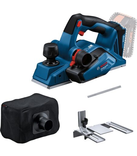Der Akku-Hobel GHO 18V-26 Professional von Bosch wurde mit der hochpräzisen Ausrichtung des Aluminiumfußes und der Tiefeneinstellplatte für perfekt flache Oberflächen entwickelt. Er ist mit einem 1-Messer-Kopf ausgestattet, der einen sehr schnellen und einfachen Messerwechsel ermöglicht. Das Wood Razor-Messer der neuen Generation ermöglicht dreimal mehr Schnitte als frühere Bosch Wood Razor Messer, bevor es stumpf wird. Im Ersatzmesserfach befindet sich bei Lieferung bereits ein Ersatzmesser. Dank des beidseitigem Spanauswurfs (links oder rechts) ist der Staubsaugerschlauch an beiden Seiten anschließbar, und Späne können links oder rechts ausgeworfen werden. Der GHO 18V-26 Professional eignet sich zum Anpassen, Hobeln und Abflachen von Holzbalken und anderen Holzteilen, zum Kantenhobeln, Falzen, Einpassen von Türen und Anfasen von Kanten. Er eignet sich für Hartholz, Weichholz, Spanplatten, OSB-Platten und MDF. Die Constant Electronic hält die Schnittgeschwindigkeit des Hobels auch unter Last konstant, und die Motorbremse stoppt die Messerwalze in weniger als einer Sekunde. Der Akku-Hobel GHO 18V-26 Professional ist dank der Universal-Schlauchmanschette mit allen 82mm-Wood Razor-Messern, allen Bosch GHO-Staubbeuteln und allen Bosch Professional Saugern kompatibel. Die benötigten Akkus sind Teil der AMPShare Alliance, dem markenübergreifenden Akku-System für Profis in Handwerk und Industrie. Ein einziger Akku passt für alle Werkzeuge und Maschinen im blauen Bosch Professional 18V System, kann aber auch markenübergreifend mit zahlreichen professionellen Werkzeugen anderer Hersteller aus der AMPShare Alliance verwendet werden. Nie mehr neue Akkus für jedes neue Werkzeug kaufen, nie mehr nach dem "richtigen" Akku suchen, mit AMPShare reicht ein Akku für alle Arbeiten. ...