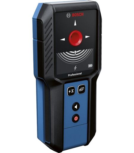 Das Ortungsgerät GMS 120-27 Professional von Bosch ist ein intuitiv zu bedienender Scanner zur Suche nach Metallen (Eisen- und Nichteisenmetalle, z.B. Armierungseisen), Holzbalken in Trockenbauwänden sowie spannungsführenden Leitungen (50 - 60Hz) in Wänden, Decken und Fußböden. Er kann Objekte bis zu einer Tiefe von 12cm orten und hilft so, Pannen beim Bohren bei Schreiner-, Sanitär-, Elektro-, Heizungs-, Lüftungs- und Klimatechnik-Arbeiten zu vermeiden. Das anwenderfreundliche Ortungsgerät bietet eine einfache Betriebsartauswahl, und durch das Markierungsloch lässt sich exakt markieren, wo Objekte geortet wurden. Wird kein Objekt unter dem Sensorbereich gefunden, leuchtet der Leuchtring grün und es ertönt kein Ton. Bei Annäherung leuchtet der Leuchtring rot und der Takt des Signaltons wird schneller. Über der Mitte eines Objektes leuchten die Anzeigen Objektmitte und es ertönt ein Dauerton zusätzlich zum roten Leuchtring. Das Ortungsgerät bestimmt nicht nur die Mitte des georteten Objekts, sondern zeigt auch seine Materialeigenschaften wie magnetisches oder nicht magnetisches Metall, eine stromführende Leitung oder nicht metallisches Material wie Holzbalken an. Das Ortungsgerät GMS 120-27 Professional ist zur Verwendung im Innen- und Außenbereich geeignet, dank stoßdämpfendem Gummigehäuse und Staub- und Spritzwasserschutz nach IP54 auch für den Einsatz auf rauen Baustellen. Mit der Dual Power Source-Technologie ist der Betrieb sowohl mit einem 10,8 Volt-, einem 12 Volt Li-Ion-Akku oder auch mit Standard-Alkalinebatterien möglich. ...