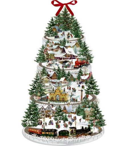 Großer konturgestanzter, beidseitig bedruckter Wandkalender mit Glitter und Schleifenband.Bitte alle einsteigen – der Zug fährt ab! Eine gemütliche nostalgische Eisenbahnfahrt rund um die winterliche Tanne verkürzt die Wartezeit auf das Fest. ...
