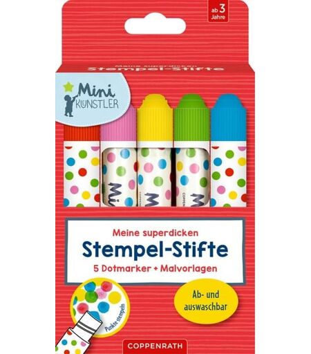 Kreativer Stempelspaß ohne Schmiererei! Mit den superdicken Stempel-Stiften aus der „Mini-Künstler-Kollektion von Die Spiegelburg entstehen bunte Punkte im Handumdrehen. Die fünf Dotmarker in Gelb, Rosa, Rot, Grün &,; Blau liegen gut in kleinen Händen und lassen sich kinderleicht auf das ca. 10 x 17,5 x 3 cm große Papier auftragen. Drei beiliegende Bilder laden zum Gestalten, Experimentieren &,; Ausprobieren ein – für fantasievolle Kunstwerke, die im Nu entstehen! ...