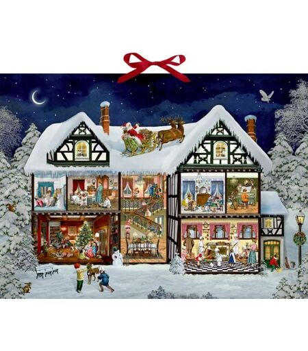 Willkommen im Adventshaus! In jedem Zimmer gibt es eine nostalgische Szene zu entdecken, und der Kalender verkürzt so die Wartezeit in der Vorweihnachtszeit. Hinter den 24 Türchen verstecken sich bezaubernde Verwandelmotive. Dekorativer Wand-Adventskalender mit Glitter und Schleifenband. ...