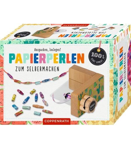 Papierperlen zum Selbermachen. Mit diesem Set lassen sich Papierperlen für Ketten und Armbänder ganz einfach selbst gestalten. Enthalten sind 1 stabile Birkenholz-Kurbel, 3 Bögen bedrucktes Papier (A4) und 1 Baumwoll-Schnur. Die vorgezeichneten Papierstreifen müssen nur ausgeschnitten und mit der Holz-Kurbel zu wunderschönen Perlen aufgedreht werden. Auf die Schnur aufgezogen, entsteht ein individuelles Schmuckstück. ...