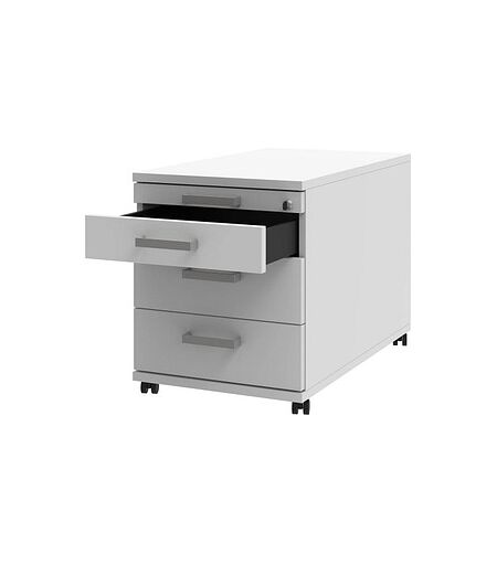 röhr Imperia Rollcontainer weiß 4 Auszüge 42,7 x 80,0 x 54,4 cm – viel Platz für Ihre UnterlagenDer röhr Imperia Rollcontainer weiß 4 Auszüge 42,7 x 80,0 x 54,4 cm ist dank seiner leichtgängigen Rollen äußerst mobil und flexibel. Er bietet genug Stauraum für alle Ihre wichtigen Utensilien und Dokumente. Positionieren Sie ihn einfach dort, wo es für Sie besonders praktisch ist und bringen Sie darin alles griffbereit unter.Alle Details der SchubladenbeschaffenheitFolgende Aufteilung bietet das Möbelstück: 4 Auszüge, genauer gesagt 1 Utensilienauszug und 3 Schubladen. Mit dieser Aufteilung, die für Ihre Geschäftsunterlagen zur Verfügung steht, sind Sie bestens ausgestattet. Hier handelt es sich um Schübe aus Stahl. Die Schubladen sind bis zu 75% ausziehbar und bieten daher eine komfortable Platznutzung. Die Auszugssperre vermeidet das gleichzeitige Öffnen mehrerer Schubladen sowie das komplette Herausziehen der einzelnen Schübe. So wird die Kippgefahr des Artikels und das Herausfallen der Schubladen gebannt.Komfortables ÖffnenModerne Relinggriffe dienen zum Öffnen und Schließen des Möbelstücks. Das Material der Griffe ist Metall.Interessantes zu Material und BauweiseDer Korpus besteht aus langlebigem Holz in einem zeitlosen Design. Machen Sie sich keine Gedanken über unschöne Schrammen oder Flecken. Die hochwertige Melaminharzbeschichtung schützt vor bleibenden Schäden z.B. nach Stößen. Sie sorgt auch für eine leichte Reinigung. Die stylische Farbe Weiß des Möbelstücks fügt sich bestimmt gut in Ihre Einrichtung ein. Die Plattenkante ist in Weiß gefertigt.Schließen Sie ab!Das Modell ist zentral abschließbar, um den Inhalt zu schützen. Folgende weitere Eigenschaften besitzt das Exemplar: mit Einschubdämpfung.Wie wäre es mit zusätzlichen Elementen zum Kombinieren aus dieser Serie?Gestalten Sie Ihr Büro modern und praktisch mit weiteren passenden Produkten aus einer großen Auswahl von Elementen des Möbelprogramms Imperia.Die passende Maße für Ihre Räume?Für eine gute Verarbeitung und Haltbarkeit spricht außerdem, dass es sich um ein Produkt "Made in Germany" handelt. Werfen Sie einen Blick auf folgende Maße: Breite: 42,7 cmTiefe: 80,0 cmHöhe: 54,4 cmDas vollständige Gewicht des Möbelstücks beträgt 36,0 kg.Überzeugt Sie dieses flexible Produkt?Dann bestellen Sie den röhr Imperia Rollcontainer weiß 4 Auszüge 42,7 x 80,0 x 54,4 cm einfach online bei uns im Shop! ...