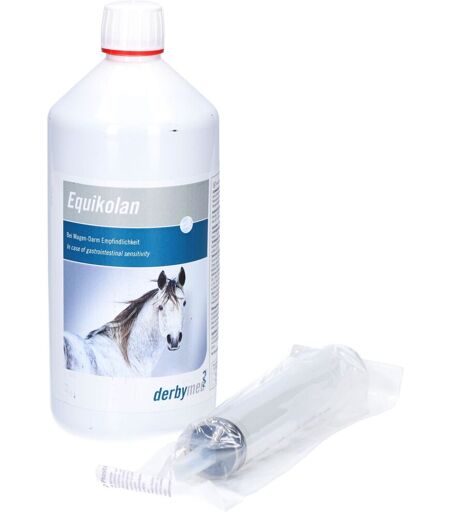 Ergänzungsfuttermittel zur Unterstützung des Magens bei Pferden Eigenschaftenderbymed® Equikolan stärkt Magen und Darm durch die Kombination von inaktivierter Hefe mit zehn pflanzlichen Komponenten. Stärkung für Magen und Darm, basierend auf pflanzlichen Bestandteilen und Hefen Stabilisiert die Dickdarmflora Reduziert Kotwasser Beruhigt die Magenschleimhaut Pflanzliche Komponenten Artischocke: stärkt den Magen und schützt die Leber. Mariendistel: unterstützt die Leberfunktion und regt den Gallenfluss an. Gelber Enzian: regt die Verdauungstätigkeit an. Kümmel: wirkt entkrampfend und blähungshemmend. Rhabarber: hat appetitanregende und antidiarrhoische Wirkung. Gelbwurz: wirkt u.a. entzündungshemmend und immunstimulierend. Schöllkraut: beruhigt den übererregten Darm. Pfefferminze: wirkt Blähungen und Krämpfen entgegen. Kamille: beruhigt den Darm bei Krämpfen und Entzündungen. Süßholzwurzel: fördert die Verdauung, wirkt krampflösend und karminativ. Fütterungsempfehlung derbymed® Equikolan wird über das Futter gegeben. Körpergewicht Koliknachsorge, Dysbiose nachoder während Antibiotikagabe,KotwassersyndromKotwassersyndrom, Koliknachsorge, allg.VerdauungsstörungenKurzfristige Gabe 10 TageLangfristige Gabe 30–90 Tage200 kg 3 x 10 ml/Tag 10 ml/Tag400 kg 3 x 20 ml/Tag 20 ml/Tag600 kg 3 x 30 ml/Tag 30 ml/TagFütterungshinweisVor Gebrauch gut schütteln!LagerungshinweiseBitte bei Zimmertemperatur lagern (15 °C–25 °C). Vor intensiver Sonneneinstrahlung schützen!Bitte beachten Sie vor dem Einsatz von derbymed® Equikolan die national und internationalgeltenden Anti-Dopingbestimmungen. ...