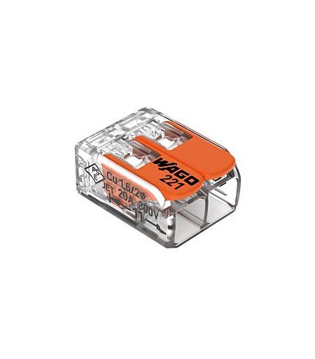 Wago 221-412 Compact-VerbindungsklemmeCOMPACT-Verbindungsklemme für alle Leiterarten max. 4 mm² 2 Leiter mit Hebeln Gehäusefarbe transparent Umgebungstemperatur max. 85 °C (T85) 4, 00 mm² transparent ...