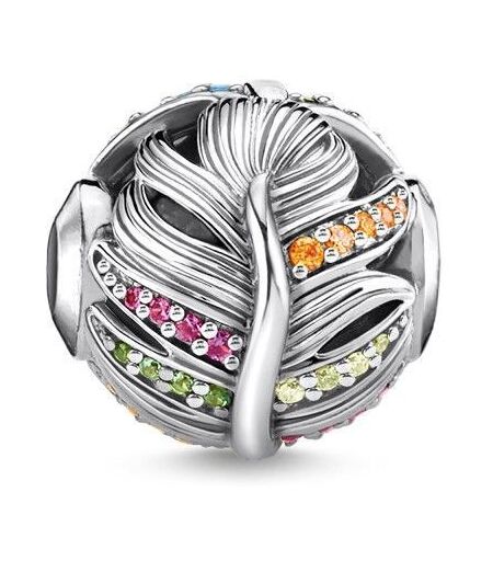 Thomas Sabo Beads Schmuck, welcher mit einem farbenprächtigem Federmotiv verziert ist. Material: 925 Sterlingsilber, geschwärzt Steine: synthetischer Korund rot, Zirkonia grün, Glas-Keramik Stein, Zirkonia orange, Zirkonia pink Farbe: orange,pink,türkis,blau,grün,rot,silberfarben Höhe: ca. 1,10 cm (0,43 Inch) Breite: ca. 1,10 cm (0,43 Inch) ...