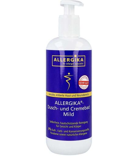 Anwendungsgebiet von Allergika Dusch- und Cremebad MildALLERGIKA®-Dusch- und Cremebad Mild – Sanfte Reinigung für empfindliche HautDas Allergika Dusch- und Cremebad Mild wurde speziell für empfindliche Haut entwickelt und reinigt besonders schonend mit hautfreundlichen Zuckertensiden, die biologisch abbaubar sind. Es hilft, den natürlichen Fett- und Feuchtigkeitsgehalt der Haut zu bewahren und ist ideal bei juckenden Hautzuständen wie Neurodermitis, Ekzemen oder Altershaut.Mit einem hautneutralen pH-Wert von 5 schützt es den Säureschutzmantel der Haut. Frei von Duft-, Farb- und Konservierungsstoffen sowie bekannten Allergenen wie Cocamidopropylbetain, wurde es dermatologisch-allergologisch getestet und von Dermatologen empfohlen. Perfekt für die tägliche Pflege von Gesicht, Körper und Händen. Ideal bei juckenden Hautzuständen wie Nesselsucht, Ekzemen, Neurodermitis und Altershaut.Wirkstoffe / Inhaltsstoffe / ZutatenInhaltsstoffe von Allergika Dusch- und Cremebad Mild:Aqua, Sodium Laureth Sulfate, Lauryl Glucoside, PEG-18 Glyceryl Oleate/Cocoate, Sodium Chloride, Caprylyl Glycol, PEG/PPG-14-/4 Dimethicone, Glycol Distearate, Citric Acid, Steareth-4, p-Anisic Acid, Propylene Glycol, Pentaerythrityl Tetra-Di-T-Butyl Hydroxyhydrocinnamate, TriisopropanolamineGegenanzeigenBei bekannter Überempfindlichkeit gegenüber einem der oben genannten Inhaltsstoffe sollte das Produkt nicht verwendet werden.DosierungAnwendungsempfehlung von Allergika Dusch- und Cremebad Mild:Einen Pumpstoß mit lauwarmem Wasser aufschäumen, den Cremeschaum auf der Haut verteilen und gründlich abspülen. Als Badezusatz 1 Esslöffel ALLERGIKA Dusch- und Cremebad Mild ins Wasser geben. Bei sehr trockener Haut empfiehlt sich das ALLERGIKA Lipo-Duschöl.Allergika Dusch- und Cremebad Mild können in Ihrer Versandapotheke www.apotheke.at erworben werden. ...