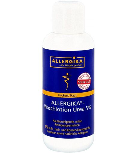 Anwendungsgebiet von Allergika Waschlotion Urea 5%Allergika Waschlotion Urea 5% – Sanfte Pflege bei trockener HautDie Allergika Waschlotion Urea 5% wurde speziell für das tägliche Duschen und Waschen von Gesicht, Händen und Körper entwickelt. Mit ihrer seifenfreien Formulierung und milden Zuckertensiden reinigt sie besonders schonend und hautverträglich – ideal für sensible und trockene Haut.Der Anteil von 5 % Urea bindet Feuchtigkeit, lindert Juckreiz und beugt Austrocknung vor. Gleichzeitig sorgt der physiologische pH-Wert 5 dafür, dass der natürliche Säureschutzmantel der Haut erhalten bleibt.Die Waschlotion ist frei von Duft-, Farb- und Konservierungsstoffen, Parabenen und natürlichen Allergenen. Zudem enthält sie keine der 328 häufigsten Kontaktallergene laut Deutscher Kontaktallergie-Gruppe.Dermatologisch empfohlen, eignet sich die Allergika Waschlotion Urea 5% für die großflächige tägliche Anwendung am ganzen Körper – sanft reinigend, feuchtigkeitsspendend und hautberuhigend.Wirkstoffe / Inhaltsstoffe / ZutatenAllergika Waschlotion Urea 5% enthält:Aqua, Sodium Laureth Sulfate,Lauryl Glucoside, Urea, PEG-18 Glyceryl Oleate/Cocoate, Sodium Chloride, Caprylyl Glycol, Lactic Acid, PEG/PPG-14/4 Dimethicone, Glycol Distearate, Steareth-4, p-Anisic AcidGegenanzeigenBei bekannter Überempfindlichkeit gegenüber einem der oben genannten Inhaltsstoffe sollte das Produkt nicht angewendet werden.DosierungAnwendungsempfehlung von Allergika Waschlotion Urea 5%:Schäumen Sie eine haselnussgroße Menge mit lauwarmem Wasser auf und verteilen Sie den cremigen Schaum auf dem Körper. Anschließend sorgfältig abspülen. Nicht über 25°C lagern.Allergika Waschlotion Urea 5% können in Ihrer Versandapotheke www.apotheke.at erworben werden. ...