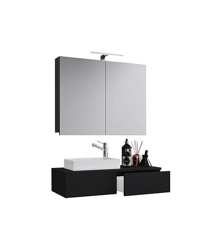 Unzertrennlich – das VCM my bath Badmöbel-Set Gudas 914836 schwarz 85,0 x 35,0 x 14,0 cmDieses VCM my bath Badmöbel-Set Gudas 914836 schwarz 85,0 x 35,0 x 14,0 cm beinhaltet elegante Badelemente, die Sie begeistern werden. Das 3-teilige Set bietet viel Stauraum für Ihre Badutensilien. Das harmonische Zusammenspiel des modernen Designs macht aus Ihrem Badezimmer eine Wohlfühl-Oase. Waschtischunterschrank inkl. Waschbecken und Spiegelschrank sind in diesem Set enthalten und passen perfekt zusammen.Wichtige Werte im Überblick:Maße: 85,0 x 35,0 x 14,0 cmAnzahl Schubladen: 1Beachten Sie bitte, dass sich diese Angaben nur auf den Waschtischunterschrank beziehen.Die Qualität der OberflächeNachfolgend erfahren Sie wichtige Informationen zu den Materialien, die verwendet wurden: Holz, aus dem das Modell besteht, hat eine lange Lebensdauer und besondere Robustheit. So haben Sie lange Freude an diesem Produkt. Die Oberfläche hat eine unempfindliche Melaminharzbeschichtung. Das macht dieses Element pflegeleicht, wasserresistent und sorgt somit für eine lange Lebensdauer. Sie erhalten mit dem VCM my bath Badmöbel-Set Gudas eine perfekte Kombination aus Keramik-Waschbecken und einem schönen Korpus.Schlichte Eleganz für jeden EinrichtungsstilDie attraktive Farbe Schwarz, die das Exemplar aufweist, fügt sich garantiert in jedes Bad harmonisch ein.Wie erfolgt die Anlieferung?Die Lieferung des VCM my bath Badmöbel-Set Gudas erfolgt inklusive Waschbecken und Spiegelschrank. Beachten Sie bitte, dass die Lieferung ohne Leuchtmittel und Armatur erfolgt. Beim Kauf dieses Möbelelements erfolgt die Lieferung zerlegt, doch der Aufbau ist kein Problem.Gefällt Ihnen das VCM my bath Badmöbel-Set Gudas?Ist die Verschönerung Ihres Bads ein Punkt auf Ihrer To-Do-Liste? Dann bestellen Sie gleich das VCM my bath Badmöbel-Set Gudas 914836 schwarz 85,0 x 35,0 x 14,0 cm hier im Shop! ...