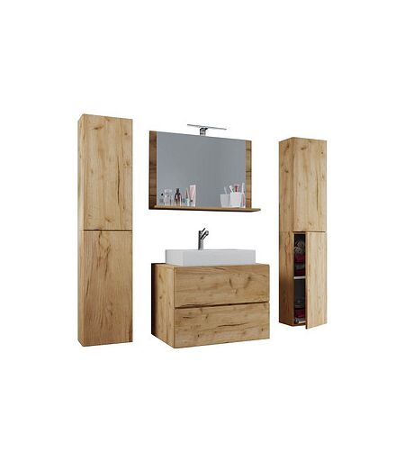 Die perfekte Kombination – das VCM my bath Badmöbel-Set Lendas XL 915215 honig-eiche 147,0 x 52,0 x 150,0 cmGestalten Sie Ihr Bad jetzt neu und schaffen Sie perfekten Stauraum für Ihre Badutensilien mit dem VCM my bath Badmöbel-Set Lendas XL 915215 honig-eiche 147,0 x 52,0 x 150,0 cm. Die durchgängige Gestaltung des 5-teiligen Sets wertet Ihr Badezimmer optisch auf. Alle Elemente haben eine platzsparende Bauweise und sorgen dennoch für viel Stauraum für Ihre Badutensilien. Das im Design aufeinander abgestimmte Set, bestehend aus Waschtischunterschrank inkl. Waschbecken, Spiegel mit Ablage und 2x Hochschrank, wertet Ihr Badezimmer gekonnt auf. Hinweis: Die Armatur ist im Lieferumfang nicht enthalten.Vorab Infos zur Größe und Ausstattung:Maße: 147,0 x 52,0 x 150,0 cmAnzahl Türen: 4Anzahl Schubladen: 2Anzahl Fachböden: 4Beachten Sie bitte, dass sich diese Angaben nur auf den Waschtischunterschrank beziehen.Sorgt für ein optisches HighlightPraktische Griffmulden dienen zum bequemen Öffnen und Schließen des Schrankes. Die Griffe bestehen aus langlebigem Kunststoff. Für einen Wohlfühleffekt sorgt die moderne Optik in Honig-eiche.Mehr zur AusstattungDieser Artikel ist mit folgender Produktausführung hergestellt: Leuchtmittel nicht im Lieferumpfang enthalten.Alles zum MaterialHier wurden für die Herstellung Komponenten verwendet, die unempfindlich gegenüber Feuchtigkeit sind, was bei Produkten fürs Bad besonders wichtig ist. Das Modell ist sehr robust und langlebig, denn es ist aus Holz gefertigt. Machen Sie sich keine Gedanken über unschöne Schrammen oder Flecken. Die robuste Melaminharzbeschichtung schützt vor bleibenden Schäden z.B. durch Wasser. Sie sorgt auch für eine leichte Reinigung. Sie erhalten mit dem VCM my bath Badmöbel-Set Lendas XL eine perfekte Kombination aus Keramik-Waschbecken und einem schönen Korpus.Was ist im Lieferumfang enthaltenDie Lieferung des VCM my bath Badmöbel-Set Lendas XL erfolgt inklusive Waschtisch-Unterschrank: 80,0 x 52,0 x 52,0 cm (BxTxH) Waschbecken: 60,0 x 42,0 x17,0 cm (BxTxH), Spiegel: 80,0 x 55,0 cm (BxH) 2 Hochschränke je: 33,0 x 22,0 x 150,0 cm (BxTxH). Beim Kauf dieses Möbelelements erfolgt die Anlieferung zerlegt, der Aufbau ist jedoch unkompliziert.Gefällt Ihnen das VCM my bath Badmöbel-Set Lendas XL?Wollen Sie Ihre neue Badgestaltung in die Hand nehmen? Dann ordern Sie gleich das VCM my bath Badmöbel-Set Lendas XL 915215 honig-eiche 147,0 x 52,0 x 150,0 cm hier im Shop. ...
