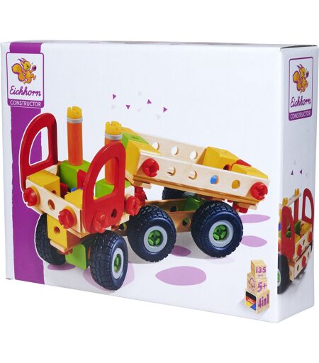 Aus dem Eichhorn Constructor LKWs Set können mit den 135 Teilen vier Modellvarianten zusammengeschraubt werden: ein LKW, ein Pick-Up, ein Kipper und ein Lieferwagen. Mit Hilfe der mitgelieferten Werkzeuge, der Anleitung und den Schrauben werden die Holzteile und Verbindungselemente miteinander fixiert und eines der Modelle entsteht. Das Zusammenfügen fördert und schult das räumliche Denken und die Feinmotorik. ...