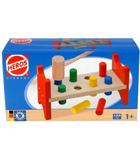 Die 8 bunten Stifte müssen mit dem Hammer durch die Löcher der Heros Klopfbank geschlagen werden. Die Klopfbank fördert die Motorik und ist ...