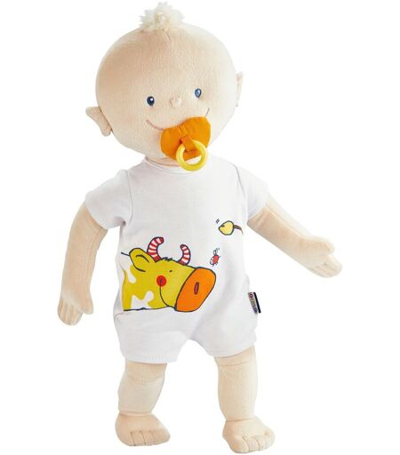 Die Kuschelpuppe Krümel von HABA eignet sich dank ihres weichen Körpers und aufgestickten Gesichts bereits für kleine Puppeneltern ab 18 Monaten. Kuschelpuppe Krümel von HABA 43 cm inkl. Body und magnetischem Schnuller aufgesticktes Gesicht Weichkörper mit Granulatfüllung im Po Obermaterial und Füllung aus Polyester, Body aus Baumwolle ab 18 Monaten geeignet Die niedliche Stoffpuppe Krümel von HABA eignet sich bereits für Kinder ab 18 Monaten. Sie ist so weich und anschmiegsam, dass sie hervorragend als Einschlafhilfe und Schmusebegleitung verwendet werden kann. Dank einer Granulatfüllung im Po nimmt Krümel auch gern für fantasievolle Rollenspiele auf dem Schoß kleiner Puppeneltern Platz. Sie können ihm den bedruckten Body wechseln oder ihn im Spiel mit dem magnetischen Schnuller beruhigen. ...