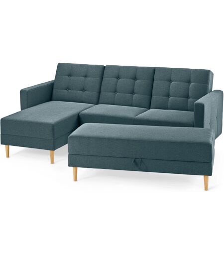 Federkern-Eckschlafsofa »Just Relax« mit Stauraumbank, blau-grau Besonders flexibel Hochwertige Verarbeitung Dieses Federkern-Eckschlafsofa aus unserer stylischen Nordic-Serie stammt von Max Winzer® und bringt den Komfort auf ein ganz neues Level. Das Möbel ist dabei gleichzeitig hochfunktional: Man kann es mit seiner 5-fach verstellbaren Rückenlehne als bequeme Couch für entspannte Momente zu Hause nutzen. Die Wellenunterfederung und Federkernpolsterung der Sitz- sowie Rückenfläche und die Gummigurtung mit Vollschaumpolsterung der Stauraumbank sorgen dabei für höchsten Sitzkomfort. Und es lässt sich mit einem Griff in ein bequemes Bett umklappen. Die Ottomane lässt sich je nach Bedarf und räumlichen Gegebenheiten links oder rechts montieren und die dazugehörige Stauraumbank kann am Sofa fixiert oder separat als Hocker genutzt werden. Alle Elemente zusammen ergeben dabei eine großzügige Liegefläche von etwa 170 x 200 Zentimetern. Das Sofa mit Beinen aus Eschen-Massivholz ist made in Germany und kann außer mit seinem modernen Design auch mit seiner Verarbeitung überzeugen: Der hochwertige, strapazierfähige Bezug hält mindestens 20.000 Scheuertouren stand und dank Rundumbezug kann das schicke Möbel auch frei im Raum stehen. Farbe: Bezug blau-grau Gestell und Füße Esche naturfarben Material: Bezug 100% Polyester Gestell und Füße Eschen-Massivholz, lackiert Maße: B x H x T ca. 223 x 93 x 152 cm Sitzfläche ca. 200 x 50 cm Liegefläche ca. 200 x 170 cm Sitz- und Liegehöhe ca. 49 cm Höhe Armlehnen ca. 66 cm Höhe Rückenlehne ca. 47 cm B x H x T Stauraumbank ca. 135 x 49 x 56 cm B x H x T Stauraum ca. 128 x 11 x 50 cm Inhalt: Inkl. Gebrauchsanweisung Tragkraft: Sofa und Bank je Sitz max. 120 kg Bett max. 240 kg Stauraum max. 10 kg Gebrauchsanweisung: Mit einer feinen Polsterdüse leicht absaugen. Flecken sofort nach dem Entstehen beseitigen. Flüssigkeiten sofort mit einem saugfähigen Küchenpapier oder Tuch abtupfen – nicht reiben! Fetthaltige und säurehaltige Verschmutzungen mit lauwarmem, destilliertem Wasser großflächig, von Naht zu Naht mit einem feuchten, sauberen Tuch, z.B. Geschirrtuch oder einem sauberen Schwamm, reinigen. Für eiweißhaltige Flecken (z.B. Blut) muss eiskaltes Wasser verwendet werden. Zur Fleckentfernung ist Feuchtigkeit notwendig. Auf keinen Fall feuchte Flecken oder Stellen mit dem Fön bearbeiten, das Material könnte beschädigt werden. Nicht auf das Möbel im feuchten bzw. nassen Zustand setzen, es können Dehnungen, Mulden oder Falten entstehen, die meist nicht mehr zu entfernen sind. Immer mindestens 1 bis 2 Tage vor Benutzung trocknen lassen. Niemals mit Lösungsmitteln (z.B. Fleckenentferner, Terpentin, Benzin) arbeiten und auf keinen Fall mit dem Dampfreiniger hantieren. Die Beseitigung von schwierigen Flecken (Kaugummi, Kugelschreiber etc.) ist ein Fall für den Fachmann. Technische Details: Sofa und Longchair mit umklappbarer Rückenlehne für Schlaffunktion. Inkl. passendem Hocker mit Stauraum, nicht sichtbar am Sofa zu befestigen.... ...