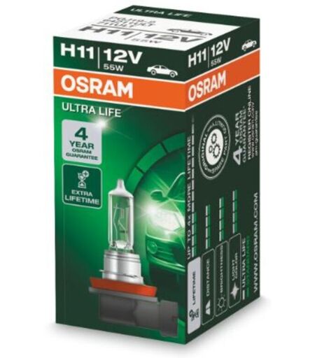 Art der Glühlampe: H11. Hersteller: OSRAM. Herstellernummer: 64211ULT. Index: OSR64211 ULT-. Lampentyp: Halogen. Linie: Ultra Life. Nennleistung [W]: 55. Spannung [V]: 12. Steckdosentyp: PGJ 19-2. Stückzahl : 1. Verpackung: Karton. ...