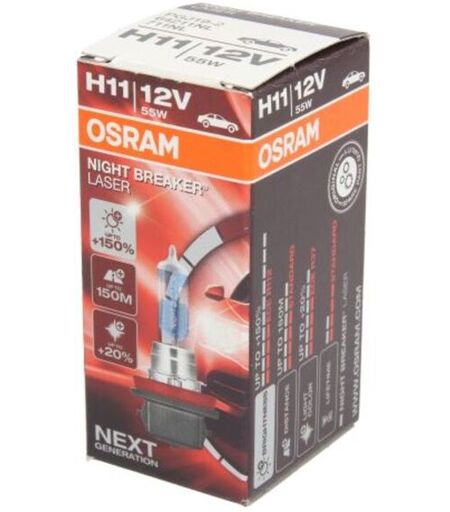 Art der Glühlampe: H11. Hersteller: OSRAM. Herstellernummer: 64211NL. Index: OSR64211 NL. Lampentyp: Halogen. Lichtfarbe: weiß. Linie: Night Breaker Laser. Nennleistung [W]: 55. Spannung [V]: 12. Steckdosentyp: PGJ 19-2. Stückzahl : 1. Verpackung: Karton. ...