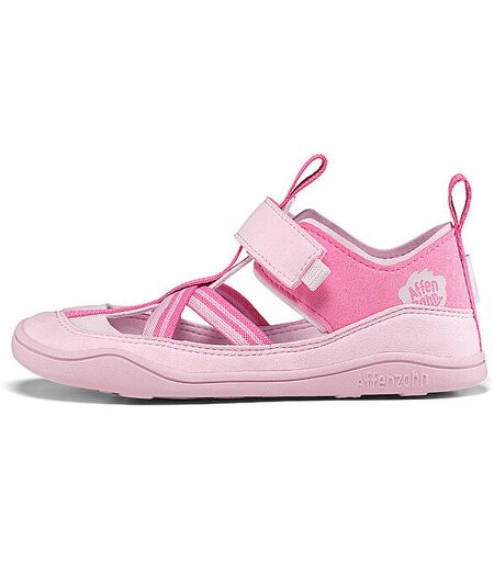 Unsere neue, luftig leichte Breezy Outdoor Sandale bietet aufgrund ihrer Form und der Zehenkappe Halt für neue Abenteuer. Mit Klettverschluss und Gummizug ist sie leicht an- und auszuziehen und perfekt auf den Fuß anpassbar. Kinder Sandalen Mit Klettverschluss Schlaufe an Lasche und Ferse Farbbezeichnung: Rosa Material: Mikrofaser Polyamid Innensohle: 30% pflanzliches Material (BLOOM™ foam), 70% Schaum Laufsohle: 30% natürliches Gummi, 70% synthetisches Gummi Die Marke Affenzahn ist Mitglied der Fair Wear Foundation. ...