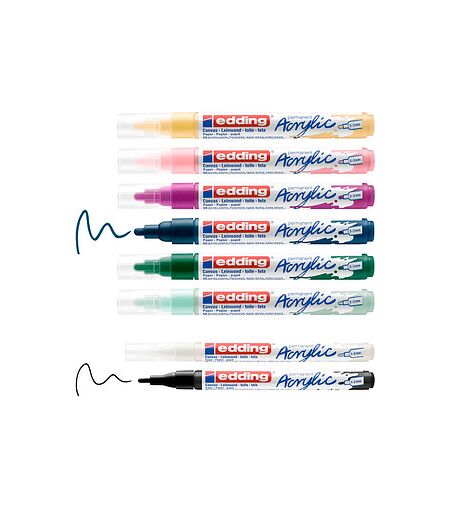 Mit Farben Ideen umsetzen – das edding nordic Acrylstifte-Set farbsortiert 1 SetDas Malen und Zeichnen mit dem edding nordic Acrylstifte-Set farbsortiert 1 Setdem edding nordic Acrylstifte-Set farbsortiert 1 Set ist sehr beliebt. Einfach in der Verarbeitung und bestens für Anfänger und auch für Profis geeignet. Die ergiebige und deckende Tinte ist ein sehr dankbares Malmaterial, mit dem sich einfach und sauber arbeiten lässt. Die Stärken liegen in der hohen Farbbrillanz und den vielfältigen Einsatzmöglichkeiten. Besonders für kreative Projekte eignet es sich sehr gut. Der Hersteller empfiehlt die Anwendung für Papier, Pappe/Karton.Diese Besonderheit zeichnet das Modell ausWerfen Sie einen Blick auf diese besondere Eigenschaft des Artikels: Ventilsystem sorgt mit gleichmäßigem Tintenfluss für hohe Deckkraft. Sie erhalten 2 Acrylmarker fein und 6 Acrylmarker medium in diesem Set.Mit klassischer RundspitzeDas Produkt besitzt eine klassisch runde Spitze – für die vielseitige Anwendung. Man kann mit den Spitzen einen Strich in der Stärke von 1,0 + 2,0 + 3,0 mm erzeugen. Die Spitze kann sogar ausgewechselt werden, wenn sie beeinträchtigt ist. Sie können Ersatzspitzen einfach und bequem nachbestellen.Mehrere Farben zur AuswahlDie Farben tiefschwarz matt, verkehrsweiß matt, mild mint matt, elegant nachtblau matt, edel mauve matt, pastellgelb matt, beere matt und moosgrün matt sind vielseitig einsetzbar und setzen Akzente in Ihren Kreationen. Für ein angenehmes Schreibgefühl und gutes Handling ist die Form der Griffzone ausschlaggebend. Bei diesem Marker ist sie rund.WischfestDie Farbe ist wischfest und haftet auf sehr vielen Materialien, ohne versehentlich zu verschmieren.GeruchsarmGut zu wissen: Der Stift sondert keinen unangenehmen Geruch ab, so wie es bei manchen Exemplaren der Fall ist – die enthaltene Tinte ist geruchsarm.PermanentJe nach Anwendungsbereich sind unterschiedliche Eigenschaften gefragt. Bei Markern wie diesem unterscheidet man zwischen "non-permanent" und "permanent", das heißt, ob sich die Tinte wieder wegwischen lässt. Diese Stifte hier sind permanent. Daher haftet Geschriebenes irreversibel und bleibt gut lesbar.LichtbeständigDie Farbe ist lichtbeständig, sodass sie selbst nach langer Zeit nicht an Kraft verliert.Dieses Produkt kann man definitiv gut gebrauchen!Für eine gute Verarbeitung und Haltbarkeit spricht, dass es sich hier um ein Produkt "Made in Germany" handelt. Bedarf an einem zuverlässigen Schreib- und Malutensil? Dann bestellen Sie das edding nordic Acrylstifte-Set farbsortiert 1 Set gleich hier in unserem Online-Shop. ...