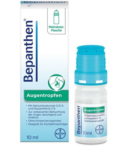 Wer an trockenen und gereizten Augen leidet, kann mit den Bepanthen® Augentropfen die Augenoberfläche befeuchten, den Tränenfilm stabilisieren und somit das Auge vor einem Trockenheitsgefühl schützen. Auf diese Weise wird eine Linderung der Beschwerden erreicht. Die Bepanthen® Augentropfen sind erhältlich als Ein-Dosis-Behältnis (praktisch für unterwegs) und in der Soft-Touch-Mehrdosisflache (insbesondere zur regelmäßigen Anwendung). Die Augentropfen enthalten weder Konservierungsstoffe noch Phosphate. Sie sind für Kontaktlinsenträger geeignet.