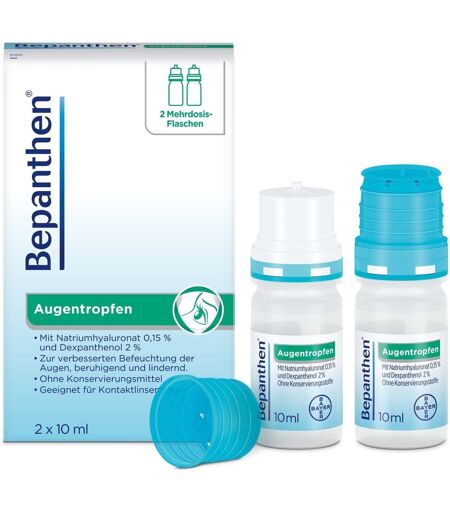 Die Lösung für trockene oder gereizte Augen: Bepanthen® Augentropfen Wer an trockenen und gereizten Augen leidet, kann mit den Bepanthen® Augentropfen die Augenoberfläche befeuchten, den Tränenfilm stabilisieren und somit das Auge vor einem Trockenheitsgefühl schützen. Auf diese Weise wird eine Linderung der Beschwerden erreicht. Die Bepanthen® Augentropfen sind erhältlich als Ein-Dosis-Behältnis (praktisch für unterwegs) und in der Soft-Touch-Mehrdosisflache (insbesondere zur regelmäßigen Anwendung). Die Augentropfen enthalten weder Konservierungsstoffe noch Phosphate. Sie sind für Kontaktlinsenträger geeignet. Bepanthen® Augentropfen bei trockenen, geröteten, juckenden und brennenden Augen Wenn die Augen brennen, jucken, sich trocken anfühlen oder gerötet sind, liegt das nicht selten an unserem heutigen Lebensstil: ständiges Starren auf einen Bildschirm, trockene Luft durch Klimaanlage im Sommer und Heizungsluft im Winter oder häufiges Reisen im Flugzeug. Ebenfalls machen Allergien wie Heuschnupfen uns und unseren Augen zu schaffen. Wird die Belastung durch Umwelteinflüsse und andere Faktoren zu groß, kann das die Zusammensetzung der Tränenflüssigkeit stören oder die Produktion der Tränenflüssigkeit verringern. Und das führt mitunter dazu, dass der Tränenfilm reißt. In der Folge reagiert das Auge gereizt und das zeigt sich unter anderem durch diese Beschwerden: Trockenheitsgefühl Brennen Juckreiz Fremdkörpergefühl verklebte Lider Lichtempfindlichkeit Sehstörungen Um dem Problem eines trockenen oder gereizten Auges wieder Herr zu werden, ist die Anwendung der Bepanthen® Augentropfen zu empfehlen. Sie unterstützen das trockene und gereizte Auge mit Feuchtigkeit, stabilisieren beziehungsweise ersetzen den Tränenfilm, schirmen das Auge vor Trockenheit ab und bieten einen Schutz auf der Hornhaut. Dank der Kombination aus Hyaluronsäure und Dexpanthenol bewirken die Bepanthen® Augentropfen eine Linderung der Beschwerden. Besonders praktisch für Kontaktlinsenträger: Ob hart oder weich, Sie brauchen die Kontaktlinsen vor dem Gebrauch nicht herausnehmen. Bepanthen® erhalten Sie in zwei Packungsgrößen: 1. Praktisch für unterwegs sind die Ein-Dosis-Behältnisse. Ihre Anwendung ist schnell und einfach: Trennen Sie eines der Ein-Dosis-Behältnisse ab und achten Sie darauf, dass dieses unbeschädigt ist. Öffnen Sie das Behältnis mit einer Drehbewegung am flachen Ende. Zur besseren Anwendung empfiehlt es sich, den Kopf etwas zurückzunehmen und das Unterlid mit einer Hand leicht vom Auge nach unten zu ziehen. Mit der anderen Hand halten Sie das Behältnis nach unten. Geben je nach Bedarf drei- bis fünfmal täglich einen Tropfen in den Bindehautsack (zwischen der Innenseite des Unterlides und dem Auge). Im Anschluss daran schließen und öffnen Sie das Auge langsam. Auf diese Weise kann sich die Flüssigkeit auf der kompletten Augenoberfläche verteilen. 2. Ihre Augen fühlen sich häufiger trocken und gereizt an? Dann sind die Bepanthen® Augentropfen in der... ...