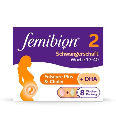 Nahrungsergänzungsmittel sind kein Ersatz für eine abwechslungsreiche und ausgewogene Ernährung und eine gesunde Lebensweise.Femibion® 2 Schwangerschaft SCHWANGERSCHAFTSVITAMINE für das 2. und 3. Trimester: Mit Cholin, DHA, Folsäure Plus (Folsäure & L-Methylfolat)³ zur Erhöhung des Folatspiegels; DHA zur Unterstützung der Gehirnentwicklung von Babys² ZUGESCHNITTENE NÄHRSTOFFKOMBINATION: 400 μg Folat, Tablette enthält Omega 3 DHA, Cholin, L-Methylfolat, Folsäure, Jod, B-Vitamine, Vitamin D, Vitamin E, Zink, Biotin, Niacin, Pantothensäure und Selen Entwickelt für dich¹ und die gesunde Entwicklung deines Babys² DHA ZUR UNTERSTÜTZUNG DER GEHIRN- UND AUGENENTWICKLUNG²: Kapsel enthält Omega-3 DHA; Enthält Fischöl Sowohl Kapsel als auch Tablette sind glutenfrei und laktosefrei ¹Vitamin D trägt zu einer normalen Funktion des Immunsystems bei ²Die Einnahme von DHA (mehrfach ungesättigte Omega-3-Fettsäure) durch die Mutter trägt zur normalen Entwicklung des Gehirns und der Augen des Fötus und beim gestillten Säugling bei. Die positive Wirkung von DHA tritt ein, wenn zusätzlich zu der für Erwachsene empfohlenen tägliche Verzehrsmenge an Omega-3-Fettsäuren (d. h. 250 mg DHA und EPA) täglich 200 mg DHA eingenommen werden. ³Folsäure Plus ist eine Kombination aus Folsäure und L-Methylfolat. L-Methylfolat ist eine Form von Folat, die direkt vom Körper verwendet werden kann. Folat wird vom Körper auch nach dem 1. Trimester benötigt, z. B. als Beitrag zum Wachstum des mütterlichen Gewebes (z. B. der Plazenta). ⁴Basierend auf einer internen Analyse von Procter & Gamble unter Verwendung von Daten aus der folgenden Quelle: IQVIA Global OTC Insights, 04A4 M/Vit+Miner Perinatal + 04B4 M/Vit W/O Miner Perinatal*; CE/W Europa (27 Länder) Umsatzvolumen nach Marken für den MAT Juni 2023 unter Berücksichtigung von Schätzungen der realen Aktivität. Copyright IQVIA. Alle Rechte vorbehalten. ⁶Femibion® ist die einzige Marke in Deutschland mit Folsäure Plus (eine Kombination aus Folsäure und L-Methylfolat) und Cholin. Zutaten: (Tablette): Füllstoff: Mikrokristalline Cellulose, Magnesiumoxid, Calcium-L-ascorbat (Vitamin C), Eisenbisglycinat, Überzugsmittel: Hydroxypropylmethylcellulose, Farbstoff: Calciumcarbonat, Maltodextrin, Nicotinamid (Niacin), Füllstoff: Vernetzte Carboxymethylcellulose, Säuerungsmittel: Citronensäure, Überzugsmittel: Polyvinylalkohol, Polyethylenglycol, Hydroxypropylcellulose, Talkum; Zinkoxid, DL-α-Tocopherylacetat (Vitamin E), Calcium-D-pantothenat (Pantothensäure), Trennmittel: Magnesiumsalze der Speisefettsäuren, Speisefettsäuren, Calciumphosphate; Zucker, Modifizierte Stärke, Pyridoxinhydrochlorid (Vitamin B6), Thiaminmononitrat (Vitamin B1), Stärke, Riboflavin (Vitamin B2), Calcium-L-methylfolat (Metafolin®), Pteroylmonoglutaminsäure (Folsäure), Kaliumiodid, Natriumselenat, D-Biotin, Cholecalciferol (Vitamin D), Cyanocobalamin (Vitamin B12). (Kapsel): DHA-haltiges Fischöl-Konzentrat, Gelatine (Rind), raffiniertes Sonnenblumenöl,... ...