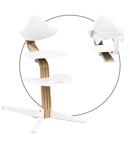 Der Stokke Hochstuhl Nomi ist mit bis zu 110 Kilogramm belastbar und ab drei Jahren nutzbar. So kann er praktisch ein Leben lang verwendet werden. Du kannst den Sitz, die Füßstütze und die Tiefe stufenlos verstellen und so immer wieder anpassen. Die Augenhöhe bei Tisch erleichtert Deinem Mini das Essenlernen und die Kommunikation am Esstisch. Das helle Eichenholz-Design bildet lässige Kontraste zu den Kunststoffelementen des Hochstuhls. Jetzt auch im praktischen Bundle mit Baby-Set. Altersempfehlung: ab 3 Jahren; ab Geburt mit Newborn-Set (separat erhältlich); ab 6 Monaten mit Baby-Set; belastbar bis 110 kg Material: Mittelträger Eiche, Rückenlehne, Sitz, Fußstütze und Fußkreuz: Polypropylen, Schrauben Metall Verstellbarkeit: stufenlose Anpassung Sicherheit: kippsichere Rollen Baby-Set: ideale Seiten- und Rückenstütze, mit Durchrutschschutz, einfach am Stuhl anzuklicken, aus recycelbarem Kunststoff, ab 6 Monaten geeignet Lieferumfang: Hochstuhl-Montage-Set Nomi von Stokke inkl. Rückenlehne, Mittelträger, Fußkreuz, Fußplatte, Sitz, Baby-Set Der Hochstuhl Nomi von Stokke lässt sich in der Sitzhöhe, der Sitztiefe jederzeit stufenlos an die veränderte Größe anpassen. Gleiches gilt für die Fußstütze – und das ganz ohne Werkzeug. Das bedeutet eine entspannte, ergonomisch gute Sitzposition in jedem Alter. Die perfekte Ergänzung sind hier das Newborn-Set, das Baby-Set und das Sitzkissen. Ohne die zusätzlichen Sets lässt sich der Hochstuhl ab einem Kindesalter von drei Jahren nutzen. Peter Opsvik hat Nomi nach den gleichen Richtlinien kreiert wie den bekannten Stuhl Tripp Trapp. Dem Mini kommt dabei die Anpassung der physischen Umgebung zugute: Sie ermuntert ihn, selbstständig das Essen zu lernen. Augenkontakt und Augenhöhe mit Eltern und Geschwistern sind im Nomi-Stuhl jederzeit eine Selbstverständlichkeit. Das Kind ist so auch nicht abgelenkt und konzentriert sich auf die Mahlzeit. Der stabile Mittelträger verleiht dem Hochstuhl seine Robustheit. Er ist verfügt über eine lange Haltbarkeit und eine große Flexibilität. Mit seinem Leichtgewicht von knapp fünf Kilogramm lässt er sich auch problemlos überall dort verwenden, wo er gebraucht wird. Die Rollen laufen leicht und geräuscharm über den Boden. Sie erleichtern spürbar den Wechsel vom Ess- zum Wohn- oder Kinderzimmer. Während der Mahlzeit kann schon mal etwas auf dem Boden landen. Wenn Du es wegwischen möchtest, hängst Du den Stuhl einfach an der Tischkante auf. Er ist mit bis zu 110 Kilogramm belastbar. So kann auch ein Schulkind, ein Jugendlicher oder Erwachsener bequem darauf Platz nehmen. Das klare Design mit der norwegischen Silhouette lässt sich in zahlreiche Ambientes unkompliziert einfügen. Der Mittelträger des Hochstuhls wird aus Eichenholz gefertigt. Wie ein schützender Arm legt sich das Baby-Set um Deinen Nachwuchs. Die Komponenten verfügen über eine Seiten- und eine Rückenstütze. So sitzt das Kind ergonomisch und sicher. Der praktische Durchrutschschutz verhindert Extratouren... ...