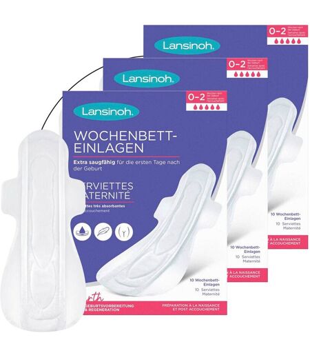 Der Dreierpack mit Wochenbetteinlagen von Lansinoh gibt Dir in den ersten beiden Wochen nach der Geburt Sicherheit. Pro Pack sind 10 Einlagen enthalten. 3er-Pack Wochenbetteinlagen von Lansinoh insgesamt 30 Stück für die ersten beiden Wochen nach der Geburt extralanges, anatomisches Design für besten Auslaufschutz hinten breiter, Hygieneschutz aus Vlies, besonders saugfähig klebende Rückseite atmungsaktiv Die extra saugfähigen Wochenbetteinlagen sind für die ersten zwei Wochen nach der Geburt geeignet. Die atmungsaktive Einlage von Lansinoh gibt Dir im Wochenbett Sicherheit. Sie nimmt Feuchtigkeit auf und eignet sich dank ihrer soften Qualität auch für empfindliche Haut. Die Einlagen sind anatomisch designt. Ihre besondere Länge, die Breite am hinteren Teil, das effektive Hygienevlies und die Flügel sorgen für einen bestmöglichen Auslaufschutz. Besonders bei direkt nach der Geburt möglichen starken Blutungen bietet das Produkt hohen, zuverlässigen Komfort. Die klebende Rückseite und die seitlichen Flügel verhindern zuverlässig das Verrutschen der Einlage. Das Produkt ist nicht mit Duft angereichert und dermatologisch getestet. ...