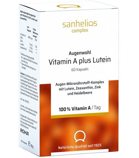 Anwendungsgebiet von Sanhelios Augenwohl Vitamin A plus Lutein KapselnSanhelios Augenwohl Vitamin A plus Lutein Kapseln sind ein Nahrungsergänzungsmittel mit Vitamin A, Zink, Lutein und Zeaxanthin.
