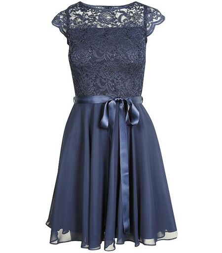 Edles Kleid für besondere Anlässe Oberteil aus romantischer Alloverspitze mit tonaler Unterlegung und schimmernden Pailletten-Details Transparenz am Dekollete Rockteil aus leichter Chiffonqualität Rundhalsausschnitt Angeschnittene kurze Ärmel Reißverschluss an der Rückseite Abgesetzte Mitte inklusive glänzender Satin-Schleife Ausgestellter, schwingender Rockteil Farbe: Marine Glänzendes Satinfutter Überknielänge Material: 100% Polyester Futter: 97% Polyester 3% Elasthan ...