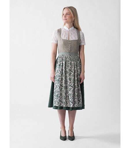 Das Dirndl DESIREE besticht durch seinen klassischen, geraden Ausschnitt und eine feminine Silhouette. Das Mieder aus einer hochwertigen Leinen-Stretch-Mischung sorgt für eine perfekte Passform und angenehmen Tragekomfort. Schattendruck verleiht dem Dirndl eine elegante Tiefe und schwingt wunderschön bei jeder Bewegung. Die Schürze mit floralem Print setzt einen stilvollen Kontrast und wird durch farblich abgestimmte Paspols und ein Schürzenband aus Baumwolle harmonisch ergänzt. Länge: ca. 72cm Farbbezeichnung: Tanne/Asch Material: 100% Baumwolle ...