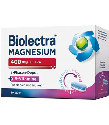 Anwendungsgebiet von Magnesium Biolectra 400 mg Ultra 3-Phasen-DepotDer Tagesbedarf an Magnesium beträgt für Erwachsene ab 25 Jahre generell etwa 300 bis 350 Milligramm. Allerdings kann der Bedarf an Magnesium und B-Vitaminen in bestimmten Lebenssituationen erhöht sein, so dass eine hochdosierte Gabe sinnvoll sein kann. Besonders in Entwicklungs- und Wachstumsphasen braucht der Körper vermehrt Mineralien wie Magnesium. So haben z. B. Jugendliche, junge Erwachsene und Stillende einen erhöhten Magnesiumbedarf. Auch bei sportlich aktiven Menschen oder Personen, die mental stark beansprucht sind oder körperlich schwere Tätigkeiten ausüben, kann eine erhöhte Magnesiumzufuhr und eine Ergänzung von B-Vitaminen notwendig sein. Magnesium unterstützt dabei u.a. die normale Muskelfunktion. B-Vitamine tragen zu einer normalen Funktion des Nervensystems und Energiestoffwechsels bei und unterstützen damit ebenfalls die Muskeln, denn auch diese werden über das Nervensystem gesteuert. Zusätzlich zu Magnesium tragen die Vitamine B2, B6 und B12 außerdem, ebenfalls zur Verringerung von Müdigkeit und Erschöpfung bei. Schon eine Tablette des Magnesium Biolectra 400 mg Ultra 3-Phasen-Depot täglich versorgt den Körper mit Magnesium und B-Vitaminen. Dank der besonderen 3-Phasen-Technologie wird das Magnesium nach und nach über einen Zeitraum von mehreren Stunden freigesetzt und für die Aufnahme zur Verfügung gestellt.