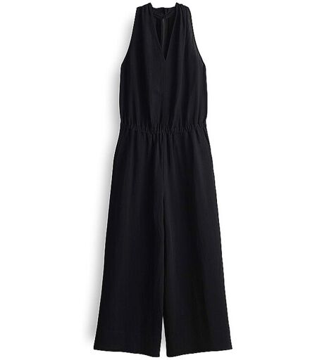 Damen Jumpsuit aus Viskose-Leinen-Mischung V-Ausschnitt Racerback im Rücken Breite Träger Französische Taschen in den Seiten Zier-Paspeltaschen am Gesäß Elastischer Bund in der Taille Weiter, gerader Beinverlauf Lockere Passform Cropped Länge Farbbezeichnung: Black Material: 71% Viskose, 29% Leinen ...