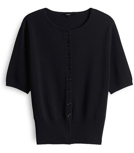 Kurzer Damen Cardigan aus Feinstrick Rundhalsausschnitt Kurzarm Mit Knopfleiste Gerade geschnitten Unifarben Farbbezeichnung: Black Material: 65% Viskose, 35% Polyamid ...