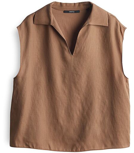 Damen Bluse aus Viskose-Mischung V-Ausschnitt mit Kragen Ohne Arm Überschnittene schultern Dezente Struktur Weite Passform Leicht verkürzt geschnitten Unifarben Farbbezeichnung: Brown Sugar Material: 55% Viskose, 45% Polyester ...