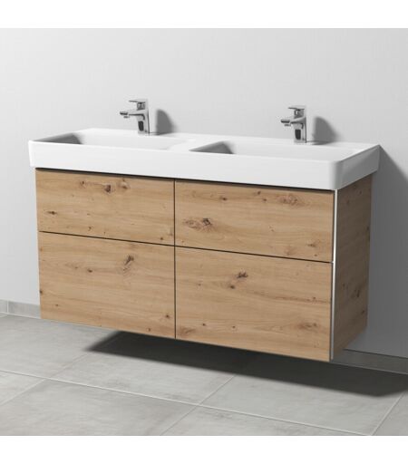 "Sanipa 3way Waschtischunterbau zu Laufen Pro S Waschtisch mit 4 Auszügen, Eiche Natural-Touch, BR78785 3way Das Bad wird zur Bühne - Sie führen Regie beim Spiel mit Formen, Farben und Größen. Drei Waschtisch-Materialien, drei Arten von Schrankmodellen und drei mögliche Griffvarianten bieten viele Lösungen, um die Geschichte zu einem großen Familienbad oder über ein kleines Gäste-WC zu erzählen. Das durchdachte System von 3way macht mit seinen individuellen Details ein großes Werk möglich. Der Applaus gehört Ihnen. Das bietet 3way: Breite Auswahl an Waschtischen in Größe und im Material mit passendem Unterbau im Set Unterbauten zu zahlreichen Waschtischen verschiedener Hersteller wählbar Grifflose Fronten mit seitlicher Griffleiste zum Öffnen und als Designmerkmal, optional klassisch mit Stangengriff Eleganter Aufsatzgriff oder grifflos mit Push to open Technik Praktische Stauraummöbel mit integriertem Wäschekorb oder Ganzkörperspiegel und Regalelemente Einzelne Beimöbel in zwei verschiedenen Tiefen Produktdetails: Griffleiste links und rechts in Chrom Grifflose Fronten mit seitlicher Griffleiste zum Öffnen und als Designmerkmal 4 Metall-Vollauszüge Auszüge mit Selbsteinzug für leichten Lauf und sanftes Schließen Auszüge mit rutschhemmendem Boden Obere Auszüge mit eckigem Siphonausschnit Innenfarbe Auszüge: Anthrazit Passender Waschtisch: Laufen Pro S Keramik-Waschtisch, Breite 120,0 cm (8149 66) Zusatzinformationen: Waschtisch nicht im Lieferumfang enthalten, bitte separat bestellen Griffleiste optional auch in Schwarz-Matt erhältlich Waschtischunterbau optional auch klassisch mit Stangengriffen erhältlich Zum Öffnen bitte seitlich links und rechts Wandabstand einplanen Farb- und Strukturabweichungen in den Abbildungen möglich weitere Produktdetails: Breite(cm): 115 Höhe(cm): 59,3 Tiefe(cm): 43,7 Gewicht (kg): 43,13 Material Korpus: Spanplatte Material Front: Spanplatte Material Griff: Metall Oberfläche Korpus: Melamin Oberfläche Front: Melamin Farbe Korpus: Eiche Natural-Touch Farbe Front: Eiche Natural-Touch Farbe Griff: Chrom Griff: mit Griffleiste Öffnungsart: Mit Auszug Montage: Wandmontage Montagezustand: Montiert Lieferumfang: Waschtischunterschrank, Befestigung Einbauart Waschtisch: Für Doppelwaschtische Besonderheiten: Beleuchtung: Ohne Beleuchtung Über den Hersteller Sanipa: Das Unternehmen Sanipa mit Sitz im fränkischen Treuchtlingen ist eine hundertprozentige Tochter der Villeroy & Boch AG und zählt zu den renommierten Partnern für den Sanitär-Fachhandel. Sanipa setzt auf Produkte, die in bester Handwerkstradition hergestellt werden und fortschrittliche Technik mit aktuellem Design verbinden. Die Badmöbel sind ""made in Germany"" und können individuell an Kundenwünsche angepasst werden." ...