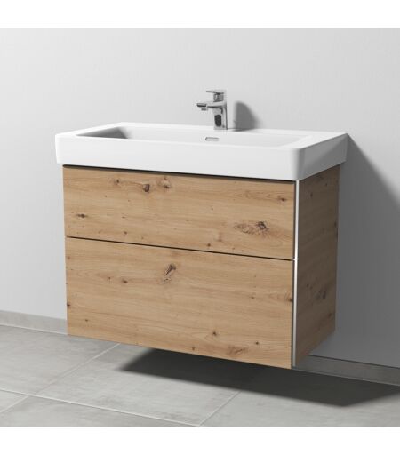 "Sanipa 3way Waschtischunterbau zu Laufen Pro S Waschtisch mit 2 Auszügen, Eiche Natural-Touch, BR76985 3way Das Bad wird zur Bühne - Sie führen Regie beim Spiel mit Formen, Farben und Größen. Drei Waschtisch-Materialien, drei Arten von Schrankmodellen und drei mögliche Griffvarianten bieten viele Lösungen, um die Geschichte zu einem großen Familienbad oder über ein kleines Gäste-WC zu erzählen. Das durchdachte System von 3way macht mit seinen individuellen Details ein großes Werk möglich. Der Applaus gehört Ihnen. Das bietet 3way: Breite Auswahl an Waschtischen in Größe und im Material mit passendem Unterbau im Set Unterbauten zu zahlreichen Waschtischen verschiedener Hersteller wählbar Grifflose Fronten mit seitlicher Griffleiste zum Öffnen und als Designmerkmal, optional klassisch mit Stangengriff Eleganter Aufsatzgriff oder grifflos mit Push to open Technik Praktische Stauraummöbel mit integriertem Wäschekorb oder Ganzkörperspiegel und Regalelemente Einzelne Beimöbel in zwei verschiedenen Tiefen Produktdetails: Griffleiste links und rechts in Chrom Grifflose Fronten mit seitlicher Griffleiste zum Öffnen und als Designmerkmal 2 Metall-Vollauszüge Auszüge mit Selbsteinzug für leichten Lauf und sanftes Schließen Auszüge mit rutschhemmendem Boden Oberer Auszug mit eckigem Siphonausschnitt Innenfarbe Auszüge: Anthrazit Passender Waschtisch: Laufen Pro S Keramik-Waschtisch, Breite 85,0 cm (8139 65) Zusatzinformationen: Waschtisch nicht im Lieferumfang enthalten, bitte separat bestellen Griffleiste optional auch in Schwarz-Matt erhältlich Waschtischunterbau optional auch klassisch mit Stangengriffen erhältlich Zum Öffnen bitte seitlich links und rechts Wandabstand einplanen Farb- und Strukturabweichungen in den Abbildungen möglich weitere Produktdetails: Breite(cm): 80 Höhe(cm): 59,3 Tiefe(cm): 43,7 Gewicht (kg): 28,06 Material Korpus: Spanplatte Material Front: Spanplatte Material Griff: Metall Oberfläche Korpus: Melamin Oberfläche Front: Melamin Farbe Korpus: Eiche Natural-Touch Farbe Front: Eiche Natural-Touch Farbe Griff: Chrom Griff: mit Griffleiste Öffnungsart: Mit Auszug Montage: Wandmontage Montagezustand: Montiert Lieferumfang: Waschtischunterschrank, Befestigung Einbauart Waschtisch: Für Wandwaschtische Besonderheiten: Beleuchtung: Ohne Beleuchtung Über den Hersteller Sanipa: Das Unternehmen Sanipa mit Sitz im fränkischen Treuchtlingen ist eine hundertprozentige Tochter der Villeroy & Boch AG und zählt zu den renommierten Partnern für den Sanitär-Fachhandel. Sanipa setzt auf Produkte, die in bester Handwerkstradition hergestellt werden und fortschrittliche Technik mit aktuellem Design verbinden. Die Badmöbel sind ""made in Germany"" und können individuell an Kundenwünsche angepasst werden." ...