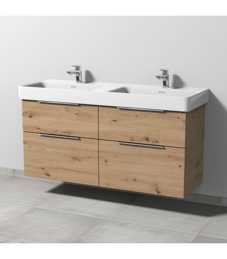 "Sanipa 3way Waschtischunterbau zu Laufen Pro S Waschtisch mit 4 Auszügen, Eiche Natural-Touch, UM77185 3way Das Bad wird zur Bühne - Sie führen Regie beim Spiel mit Formen, Farben und Größen. Drei Waschtisch-Materialien, drei Arten von Schrankmodellen und drei mögliche Griffvarianten bieten viele Lösungen, um die Geschichte zu einem großen Familienbad oder über ein kleines Gäste-WC zu erzählen. Das durchdachte System von 3way macht mit seinen individuellen Details ein großes Werk möglich. Der Applaus gehört Ihnen. Das bietet 3way: Breite Auswahl an Waschtischen in Größe und im Material mit passendem Unterbau im Set Unterbauten zu zahlreichen Waschtischen verschiedener Hersteller wählbar Grifflose Fronten mit seitlicher Griffleiste zum Öffnen und als Designmerkmal, optional klassisch mit Stangengriff Eleganter Aufsatzgriff oder grifflos mit Push to open Technik Praktische Stauraummöbel mit integriertem Wäschekorb oder Ganzkörperspiegel und Regalelemente Einzelne Beimöbel in zwei verschiedenen Tiefen Produktdetails: Eleganter Aufsatz-Griff in Chrom Grifflänge: 33,0 cm Griffplatzierung: oben mittig 4 Metall-Vollauszüge Auszüge mit Selbsteinzug für leichten Lauf und sanftes Schließen Auszüge mit rutschhemmendem Boden Obere Auszüge mit eckigem Siphonausschnitt Innenfarbe Auszüge: Anthrazit Passender Waschtisch: Laufen Pro S Keramik-Waschtisch, Breite 130,0 cm (8149 68) Zusatzinformationen: Waschtisch nicht im Lieferumfang enthalten, bitte separat bestellen Aufsatz-Griff optional auch in Schwarz-Matt erhältlich Farb- und Strukturabweichungen in den Abbildungen möglich weitere Produktdetails: Breite(cm): 125 Höhe(cm): 59,3 Tiefe(cm): 43,7 Gewicht (kg): 62,56 Material Korpus: Spanplatte Material Front: Spanplatte Material Griff: Metall Oberfläche Korpus: Melamin Oberfläche Front: Melamin Farbe Korpus: Eiche Natural-Touch Farbe Front: Eiche Natural-Touch Farbe Griff: Chrom Griff: mit Griff Öffnungsart: Mit Auszug Montage: Wandmontage Montagezustand: Montiert Lieferumfang: Waschtischunterschrank, Befestigung Einbauart Waschtisch: Für Wandwaschtische Besonderheiten: Beleuchtung: Ohne Beleuchtung Über den Hersteller Sanipa: Das Unternehmen Sanipa mit Sitz im fränkischen Treuchtlingen ist eine hundertprozentige Tochter der Villeroy & Boch AG und zählt zu den renommierten Partnern für den Sanitär-Fachhandel. Sanipa setzt auf Produkte, die in bester Handwerkstradition hergestellt werden und fortschrittliche Technik mit aktuellem Design verbinden. Die Badmöbel sind ""made in Germany"" und können individuell an Kundenwünsche angepasst werden." ...