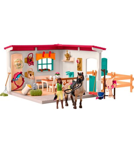 Die Sattelkammer aus der Serie Horse Club ist perfekt ausgestattet: Bürsten und Striegel liegen schon auf dem Tisch, um das Pferdefell wieder zum Glänzen zu bringen. Diese Wohlfühlbehandlung hat es gern. Im Schrank sind verschiedene Pferdedecken, die unter den Sattel gelegt werden können. Das passende Zaumzeug hängt natürlich auch an der Wand. Hier lässt es sich aushalten! Das finden auch Hund und Katze. Die beiden sind schon ganz aufgeregt und leisten beim Striegeln Gesellschaft. Den Apfel bekommt aber das Pferd zur Belohnung! ...