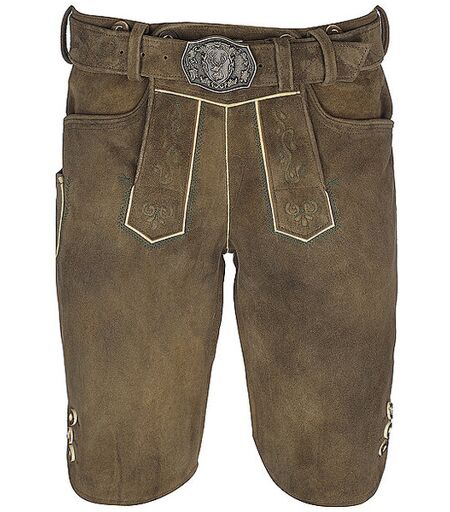 Herren Wildbock-Lederhose mit hochwertigem Gürtel Kurzes Bein Farbbezeichnung: Bisam Inklusive Gürtel mit rustikaler Vollschnalle aus Metall Zwei Taschen an der Vorderseite Eine paspelierte Gesäßtasche mit Knopf Seitliche Messertasche Bundweite durch rückseitiges Lederband individuell verstellbar Material: 100% Echt-Leder (Wildbock) Pflegetipp: Lederspezialreinigung ...