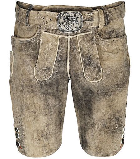 Herren Lederhose aus softem Veloursleder Kurze Lederhose Reguläre Leibhöhe Gerades Bein Hosenlatz mit traditionellen Stickereien Hosenbund mit Zwickel zum Schnüren auf der Rückseite Abnehmbarer Gürtel mit markanter Schließe Seitliche Eingrifftaschen auf der Front Kleine Tasche am seitlichen Hosenbein Eine Gesäßtasche mit Knopf Beinabschluss mit seitlicher Schnürung Traditionelle Stickereien und Hornknöpfe Farbbezeichnung: Camel St 134 D Saand Material: Leder ...
