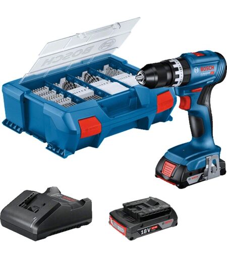 Der Bosch Akku-Schlagbohrschrauber GSB 18V-45 Professional ist eine kraftvolle Akku-Schlagbohrmaschine mit bürstenlosem Motor, der mit 45 Nm und 1.900 U/min genug Power für alle gängigen Anwendungen bietet. Das robuste 13mm-Metall-Schnellspannbohrfutter gewährleistet ausgezeichnete Drehmomentübertragung bei jeder Arbeit, und die kompakte Kopflänge von 174mm sorgt für perfekte Handlichkeit. Der GSB 18V-45 Professional eignet sich zum Bohren in Holz, Metall, Keramik und Kunststoff, außerdem zum Schlagbohren in Ziegel, Mauerwerk und Gestein. Er ist mit allen Bosch Professional 18V-Akkus und -Ladegeräten (Professional 18V System) kompatibel. Außerdem verfügt er über einen praktischen Gürtelclip für bequemes Einhängen des Akkuschraubers am Gürtel oder an der Leiter. Im Deckel des L-Case ist ein 82-teiliges Zubehör-Set mit Bits und Bohrern untergebracht. ...