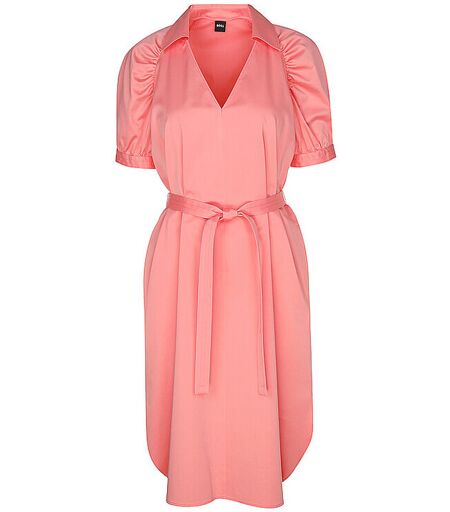 Elegantes Damen Midikleid aus Baumwoll-Stretch Tiefer V-Ausschnitt mit Kragen Kurzarm Raglanärmel mit Raffung, schmalem Bündchen und Knopfverschluss Seitliche Eingrifftaschen Bindegürtel in der Taille Kurze Seitenschlitze Abgerundeter Saumabschluss Länge: 104 cm Unifarben Farbbezeichnung: Open Purple Material: 96% Baumwolle, 4% Elasthan ...