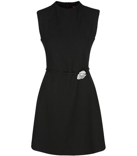 Damen Minikleid aus Viskose-Mischung Rundhalsausschnitt Ohne Arm Schulterpolster Schließt mit Reißverschluss in der hinteren Mitte Bindegürtel mit Blume aus Strass in der Taille Gerade Passform Länge: Ca. 89 cm Unifarben Farbbezeichnung: Black Material: 64% Polyester, 31% Viskose, 5% Elasthan Futter: 100% Polyester ...