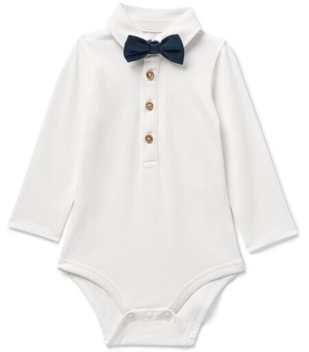 Baby-Body mit Fliege Farbe: Weiß mit dunkelblauer Fliege Material: 95% Baumwolle (aus ökologischem Anbau), 5% Elasthan Sonstige Hinweise: Größenlauf/Alter: Gr. 74/80 (ca. 6 – 12 M.) Gr. 86/92 (ca. 1 – 2 J.) Gr. 98/104 (ca. 2 – 4 J.) Angenehm weiche Single-Jersey-QualitätFliege mit Klettverschluss zum AbnehmenMit Knöpfen auf der Vorderseite zum einfachen An- und AusziehenGOTS organic, zertifiziert durch CU 809415Dieser Strampler schützt Wasserressourcen. ...