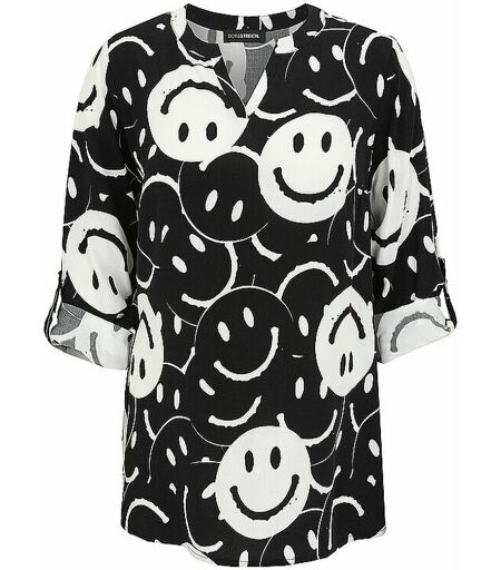 Damen Bluse aus reiner Viskose Tunikaausschnitt 3/4 Ärmel Allover Smiley Print Fließender Fall Gerade Passform Farbbezeichnung: Schwarz / Weiss Material: 100% Viskose ...