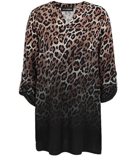 Damen Bluse aus reiner Viskose Tunikaausschnitt 3/4 Ärmel Animalprint mit Farbverlauf Kellerfalte im Rückenteil Lockere Passform Langer Schnitt Farbbezeichnung: Bast Material: 100% Viskose ...
