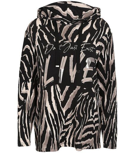 Damen Hoodie aus Viskose-Mischung mit Stretch-Anteil Kapuze mit Tunnelzug Langarm Überschnittene Schultern Allover Animal Print Wording-Print im Vorderteil Gerade Passform Langer Schnitt Farbbezeichnung: Taupe Material: 95% Viskose, 5% Elasthan ...