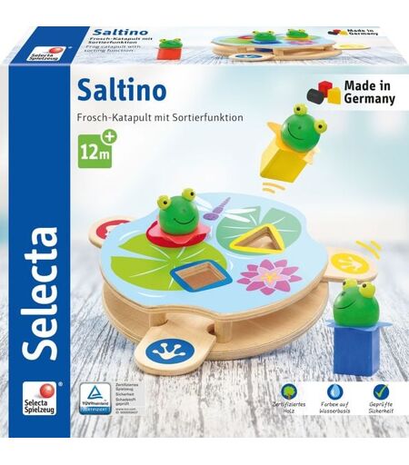 "Die drei Frösche können nach Farbe und Form in die dazu passenden Öffnungen sortiert werden. Sind alle Frösche sortiert, kann man sie mit einem Schlag auf das passende Farbplättchen wieder aus dem Teich herausspringen lassen. Ein lustig-wilder Froschhüpfspaß! Inhalt: Sortierbrett mit Hüpffunktion, 3 Frösche Der Verlag Schmidt Spiele steht seit 1907 für Ideereichtum und Qualität. Der Schmidt Spiele Verlag zählt zu den bekanntesten deutschen Spieleherstellern. Er umfasst die Marken Schmidt Spiele im Bereich Puzzles, Plüsch, Kinder-, Familien- und Erwachsenenspiele, Drei Magier, die für anspruchsvolle Kinderspiele steht, sowie Selecta im Bereich Holzspielzeug. An die 1000 verschiedene Artikel stecken im Schmidt Spiele-Programm. Dazu gehören Klassiker, wie Mensch ärgere Dich nicht, Kniffel und Ligretto, aber auch mehr als 150 Artikel, die jährlich als Neuheiten erscheinen. Damit aus den Kleinen mal was Großes werden kann, ist es wichtig, sie von Anfang an altersgerecht zu fördern, ohne zu überfordern. Dafür entwickelt die deutsche Traditionsmarke ""Selecta Spielzeug"" seit über 50 Jahren qualitativ hochwertiges Holzspielzeug. Die pädagogisch wertvollen Designs werden in liebevoller Handarbeit aus dem Naturprodukt Holz hergestellt. Selbstverständlich gesundheitlich völlig unbedenklich, langlebig und TÜV-geprüft. " ...
