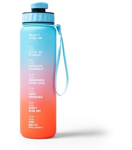 Die farbenfrohe 1 l Flasche aus robustem Kunststoff mit praktischem Trinkverschluss tut richtig gut. Die innovative Zeitmarkierung hilft, über den Tag verteilt genug zu trinken – 1 L vormittags, 1 L nachmittags. Der perfekte Begleiter für Ausflug, Urlaub, Sport, Wellness und mehr. Extra mit einer praktischen Schlaufe ausgestattet. Um die Farbe und Schönheit zu erhalten bitte von Hand spülen. Achtung: Wenn Sie heißes Wasser einfüllen, die Flasche nicht schütteln, um Verbrühungen durch übermäßiges Druck in der Flasche zu vermeiden. ...