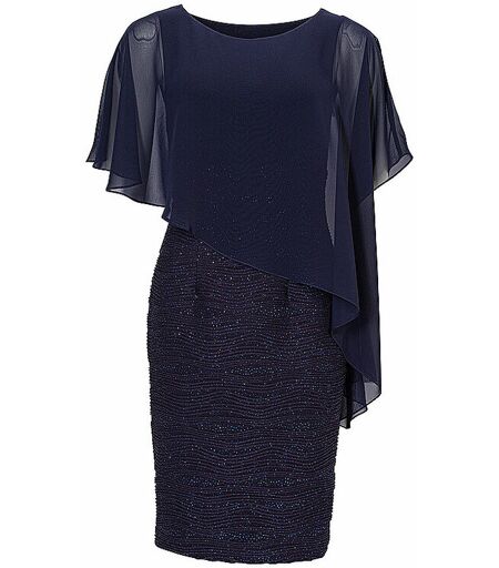 Dekoratives Damen-Kleid mit Allover Glitzer Fixiertes Cape aus fließendem Chiffon Farbe: Marine Rundhalsausschnitt Fledermausärmel Körpernahe Passform Überknielänge Leichtes Futter aus Microfaserjersey Material: 100% Polyester Futter: 95% Polyester 5% Elasthan ...